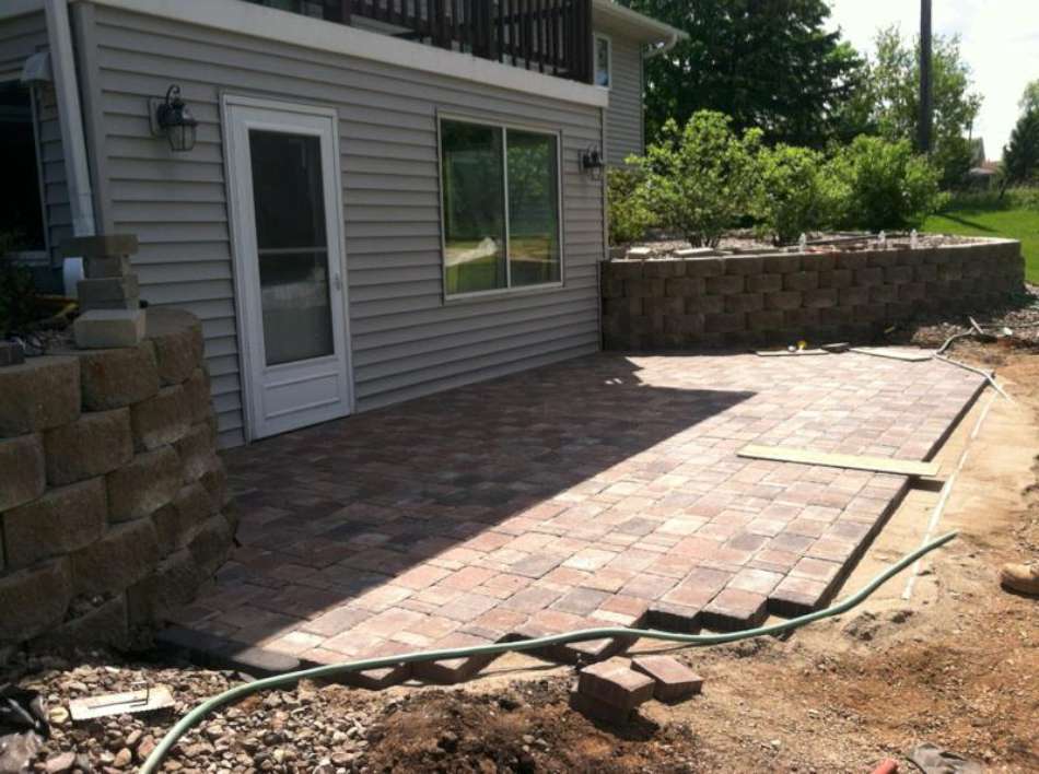 After S. and M. Leach patio. (Brown retaining block and cap, Fieldstone 3 sizes patio)